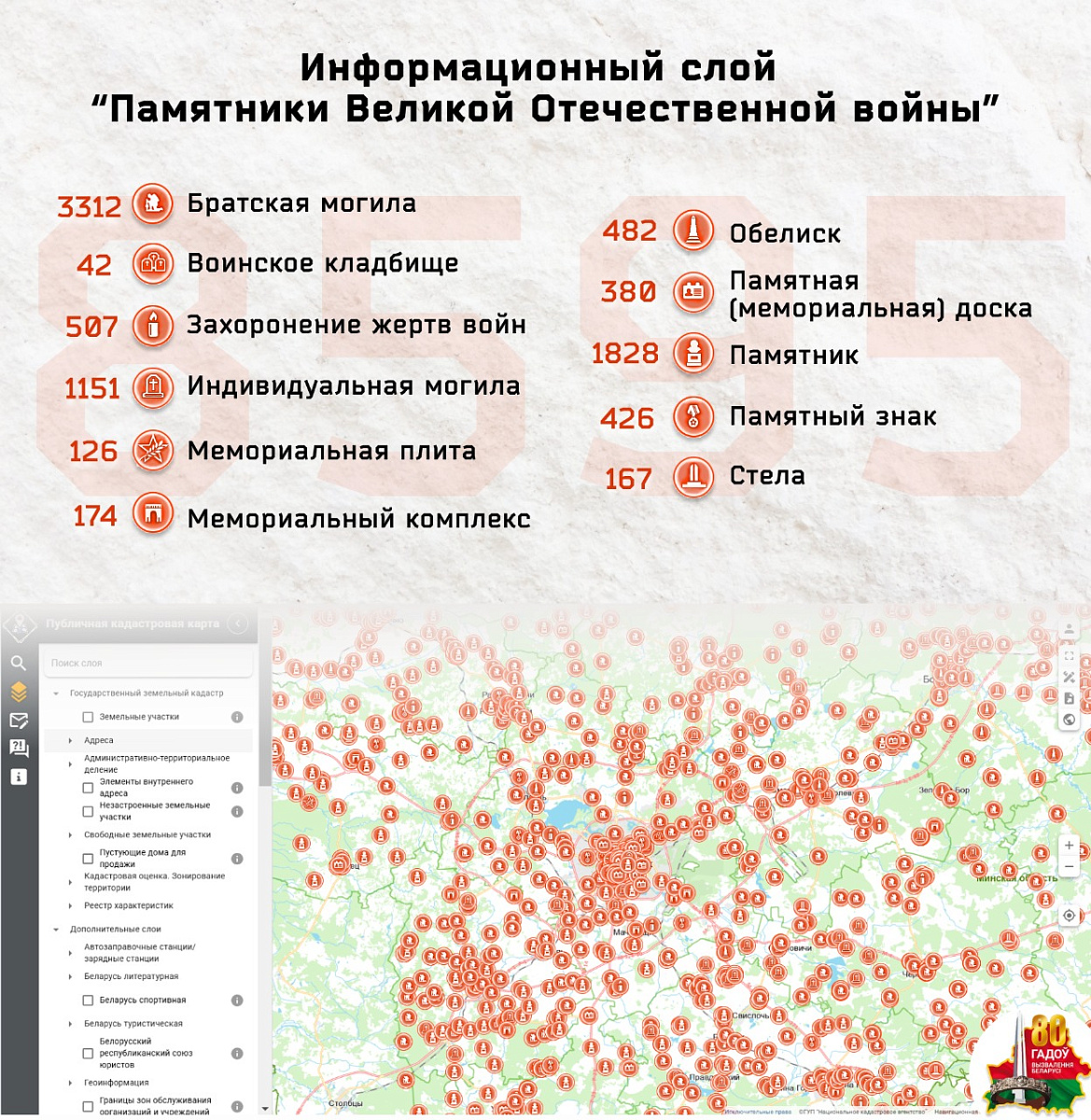 В год 80-летия знаменательного события на Публичной кадастровой карте (ПКК) обновлен слой «Памятники Великой Отечественной войны», добавлено 90 новых объектов. Поддержание данных о местоположении памятников на карте, их фото, описании в актуальном состоянии обеспечивает сохранение памяти о героизме советского народа, защитившего Родину от врага. Каждое знаковое место, каждое захоронение, каждая мемориальная плита и памятная доска — символы несломленного духа, единства и стойкости нашего народа в борьбе за свободу и независимость.