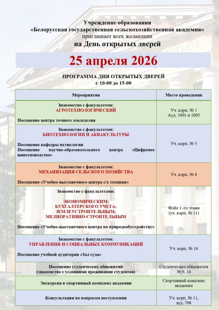 25 апреля 2026 года в УО «Белорусская государственная орденов Октябрьской Революции и Трудового Красного Знамени сельскохозяйственная академия» пройдет День открытых дверей.