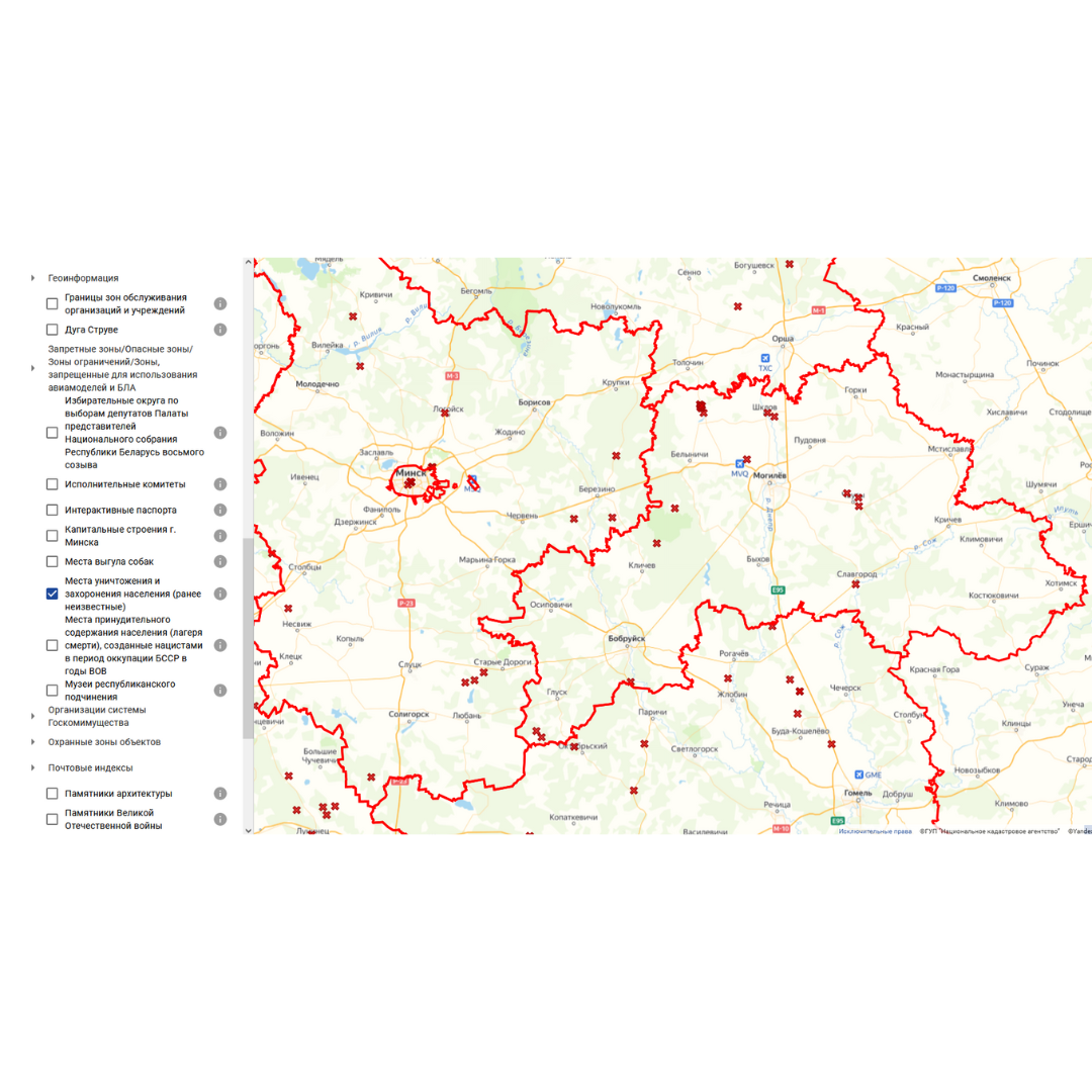 Одним из итогов расследования уголовного дела о геноциде населения Беларуси в годы Великой Отечественной войны и послевоенный период стало выявление ранее неизвестных мест уничтожения и захоронения населения. Данная информация визуализирована на ПКК в виде нового пространственного слоя ”Места уничтожения и захоронения населения (ранее неизвестные)“, на текущий момент выявлено 163 таких места, 144 из которых отображены на ПКК.