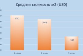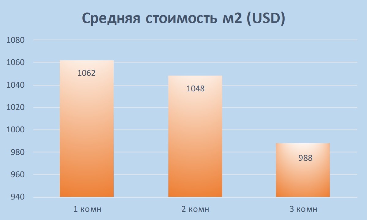 Средняя стоимость квадратного метра за истекший месяц в разрезе количества комнат закрепилась на таких значениях: однокомнатные квартиры 1062 $ (+0,2%), двухкомнатные 1048 $ (+2%), трехкомнатные и более 988 $ (+0,6%).