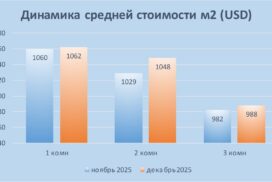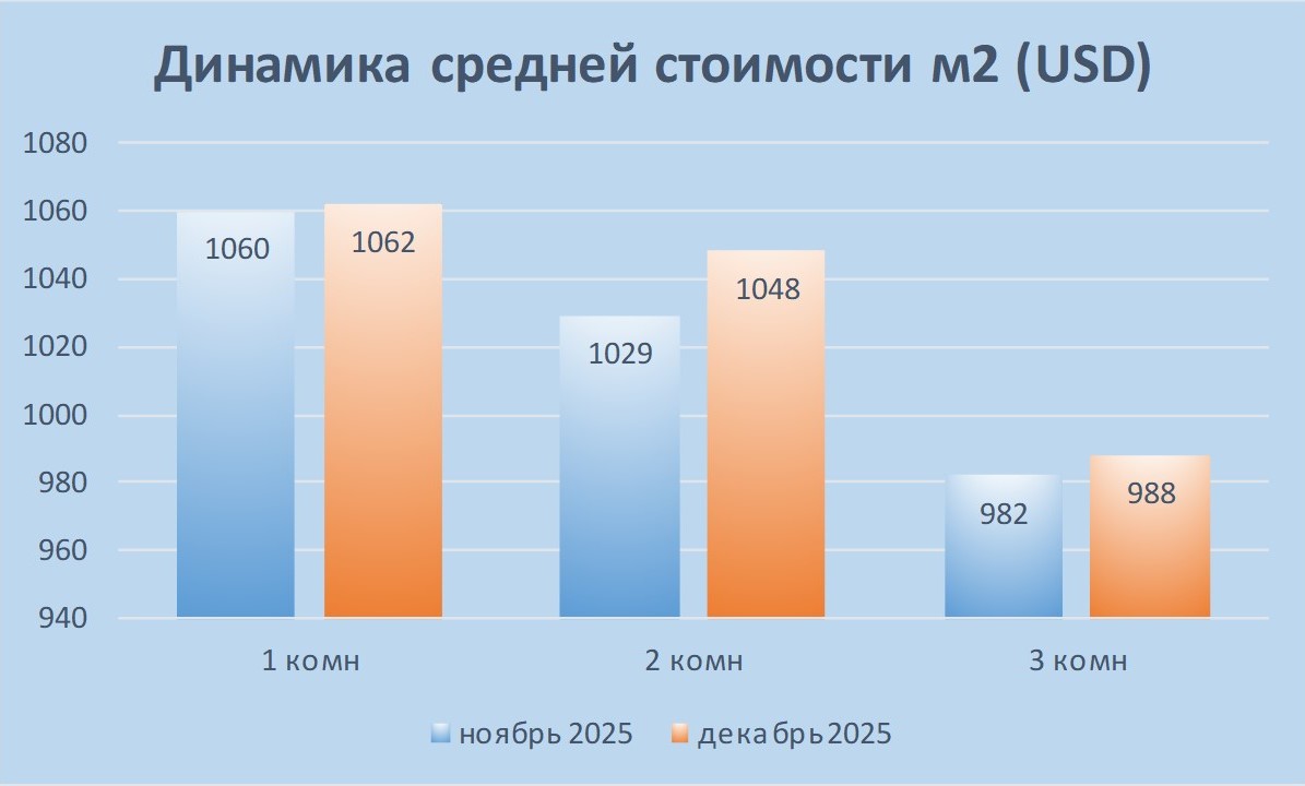 Стоимость квадратного метра в иностранной валюте увеличилась на 2,4%. В среднем, стоимость 1 кв.м. жилья в декабре составила 1052 $ (против 1027 $ за 1 кв.м. в ноябре).