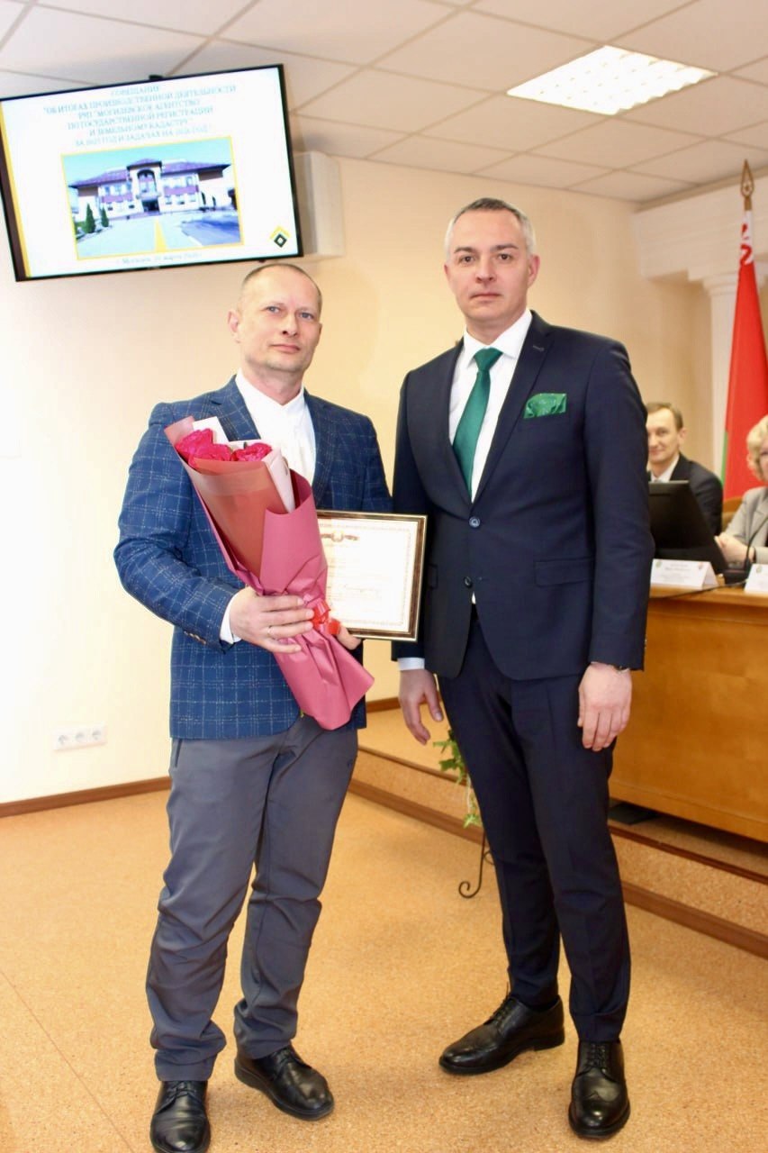 Председатель Государственного комитета по имуществу Виталий Иосифович Невера, генеральный директор научно-производственного государственного республиканского предприятия ”Национальное кадастровое агентство“ Виктория Викторовна Красовская, начальник главного управления землеустройства Могилевского областного исполнительного комитета Ирина Михайловна Петрученя, Председатель комитета государственного имущества Могилевского областного исполнительного комитета Олег Владимирович Мякинький, директор республиканского дочернего унитарного предприятия ”Проектный институт Могилевгипрозем“ Геннадий Георгиевич Барковский.