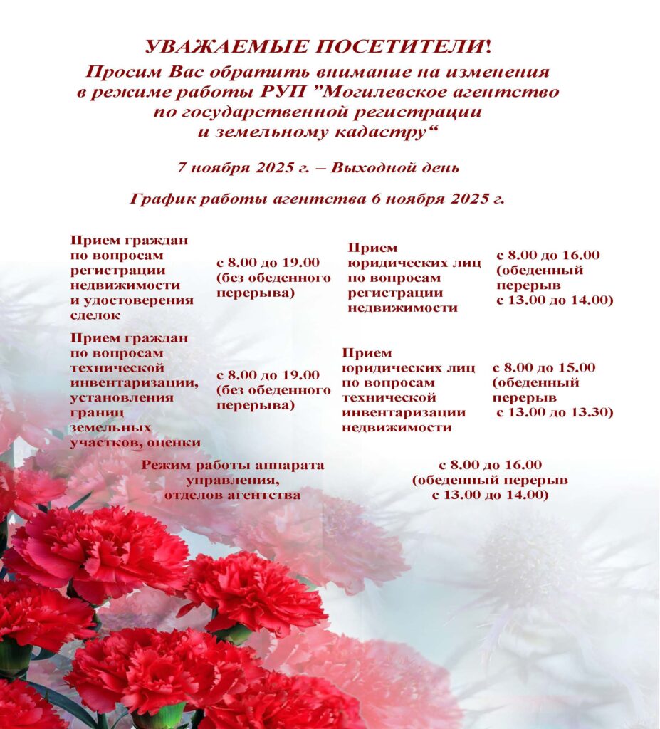 РУП «Могилевское агентство по государственной регистрации и земельному кадастру» информирует! admin700 03.11.2025 Новости Изменения в режиме работы головного агентства, филиалов и бюро РУП «Могилевское агентство по государственной регистрации и земельному кадастру» в предпраздничные и праздничные дни: Навигация по записям Предыдущий Предыдущая запись: 11 ноября 2025 года пройдет прямая телефонная линияСледующий Следующая запись: 14 ноября 2025 года выездной личный прием заявителей г. Белыничи.
